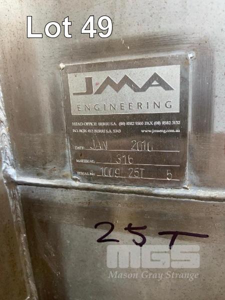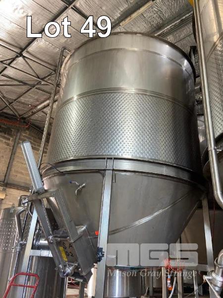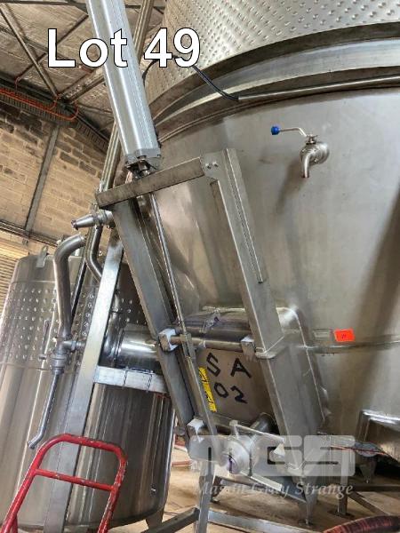 FERMENTATION TANK, SWEEP ARM, FREE STANDING JMA ENGINEERING CENTRE AGITATOR 316 STAINLESS STEEL DOM: 2010 EACH 25 TONNE CAPACITY AIR GATE SIDE HATCHES, 75 & 50mm VALVE EACH WITH STAINLESS STEEL CENTRIFUGAL MIXING PUMP, 415V DIMENSIONS: 6.4 (H) x 3.3m DIAMETER APPROX