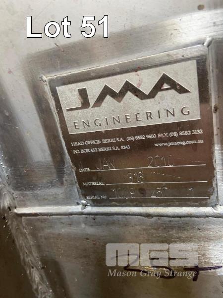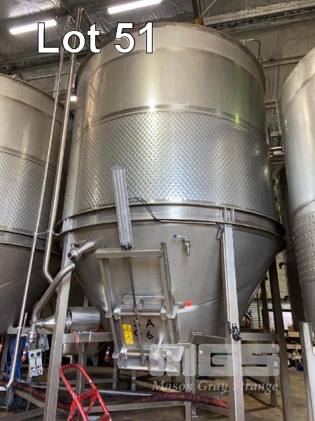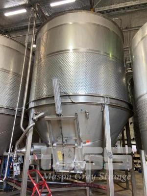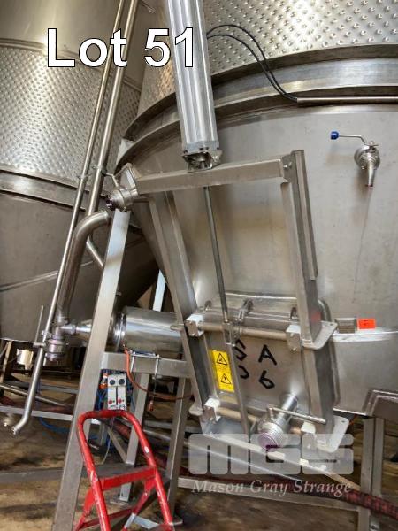 FERMENTATION TANK, SWEEP ARM, FREE STANDING JMA ENGINEERING CENTRE AGITATOR 316 STAINLESS STEEL DOM: 2010 EACH 25 TONNE CAPACITY AIR GATE SIDE HATCHES, 75 & 50mm VALVE EACH WITH STAINLESS STEEL CENTRIFUGAL MIXING PUMP, 415V DIMENSIONS: 6.4 (H) x 3.3m DIAMETER APPROX