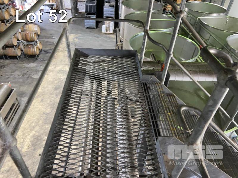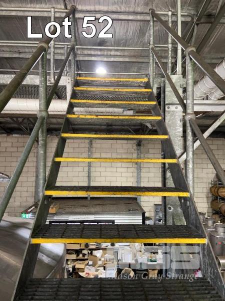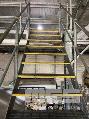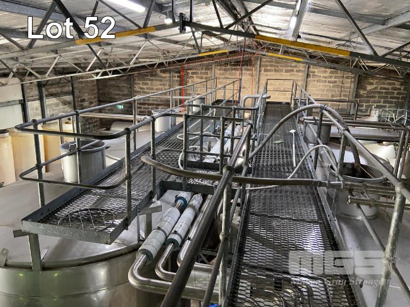 CAT WALK x 2 OVER 25 FERMENTERS 1 x 11m & HAND RAIL, STRETCH METAL FLOOR, 1 x 14m & HAND RAIL, STRETCH METAL FLOOR APPROX & 14 x TREAD ACCESS STEP TO 1ST LEVEL & INCLUDES HORIZONTAL PIPE ONLY, 50-500mm OVER APPROX 16m OF FRAME WORK (CUTTING LINES MARKED) TO BE REMOVED WITH IN 7 DAYS OF SALE)