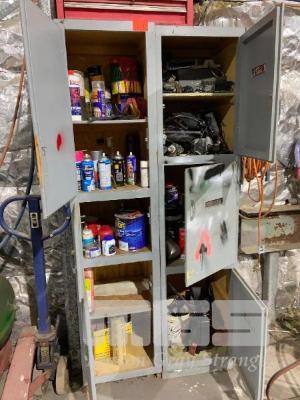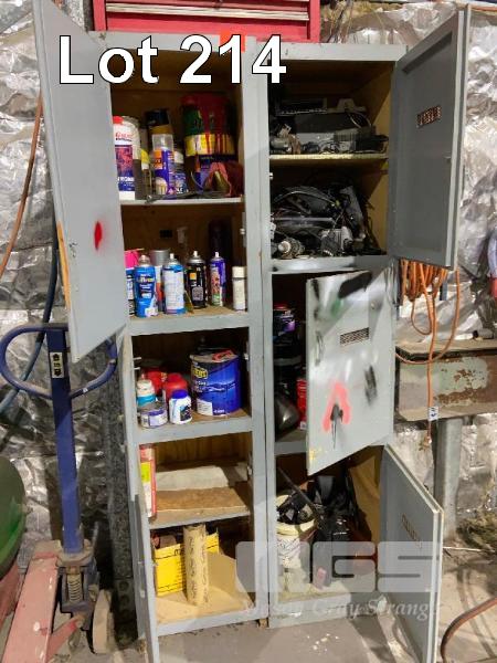 2 x TIMBER CUPBOARD WITH PAINTS, LUBRICANTS, ELECTRONICS, ETC