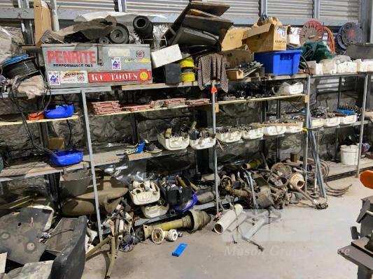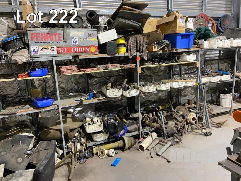 2 x TUBE STEEL RACKS, 3600mm APPROX & CONTENTS INCLUDING FASTENERS, TRACTOR PTO SPARES, ETC
