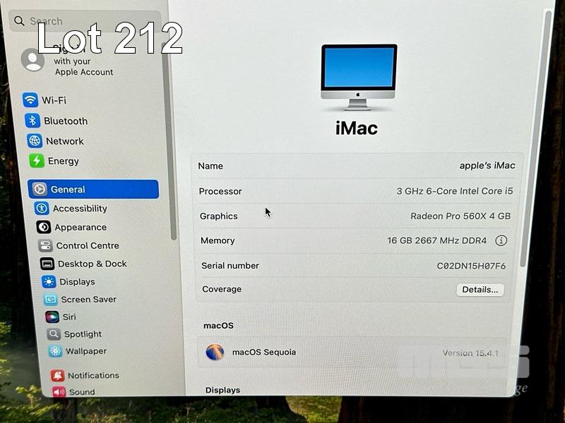 APPLE iMAC (A2116), CORE i5 8500 (8TH GEN) @ 3GHz, 16GB DDR4 RAM, 512GB SSD, BUILT-IN 21.5" RETINA DISPLAY (4096x2304), 4GB RADEON PRO 560X VIDEO, Wi-Fi, BLUETOOTH, MAC OS 15 INSTALLED, APPLE KEYBOARD & KENSINGTON MOUSE S/N:C02DN15H07F6