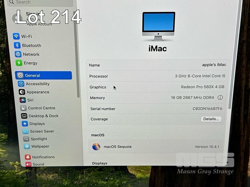 APPLE iMAC (A2116), CORE i5 8500 (8TH GEN) @ 3GHz, 16GB DDR4 RAM, 512GB SSD, BUILT-IN 21.5" RETINA DISPLAY (4096x2304), 4GB RADEON PRO 560X VIDEO, Wi-Fi, BLUETOOTH, MAC OS 15 INSTALLED, APPLE KEYBOARD & KENSINGTON MOUSE S/N:C02DN16607F6