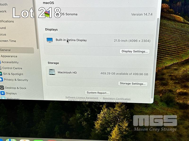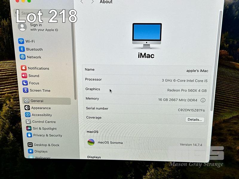 APPLE iMAC (A2116), CORE i5 8500 (8TH GEN) @ 3GHz, 16GB DDR4 RAM, 512GB SSD, BUILT-IN 21.5" RETINA DISPLAY (4096x2304), 4GB RADEON PRO 560X VIDEO, Wi-Fi, BLUETOOTH, MAC OS 14 INSTALLED, APPLE KEYBOARD & KENSINGTON MOUSE S/N:C02DN15Z07F6