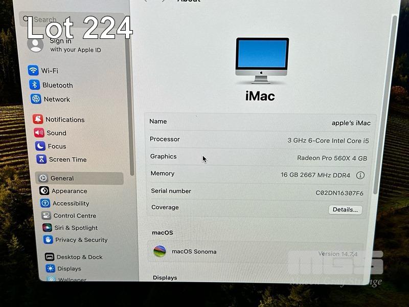 APPLE iMAC (A2116), CORE i5 8500 (8TH GEN) @ 3GHz, 16GB DDR4 RAM, 512GB SSD, BUILT-IN 21.5" RETINA DISPLAY (4096x2304), 4GB RADEON PRO 560X VIDEO, Wi-Fi, BLUETOOTH, MAC OS 14 INSTALLED, APPLE KEYBOARD & KENSINGTON MOUSE S/N:C02DN16307F6