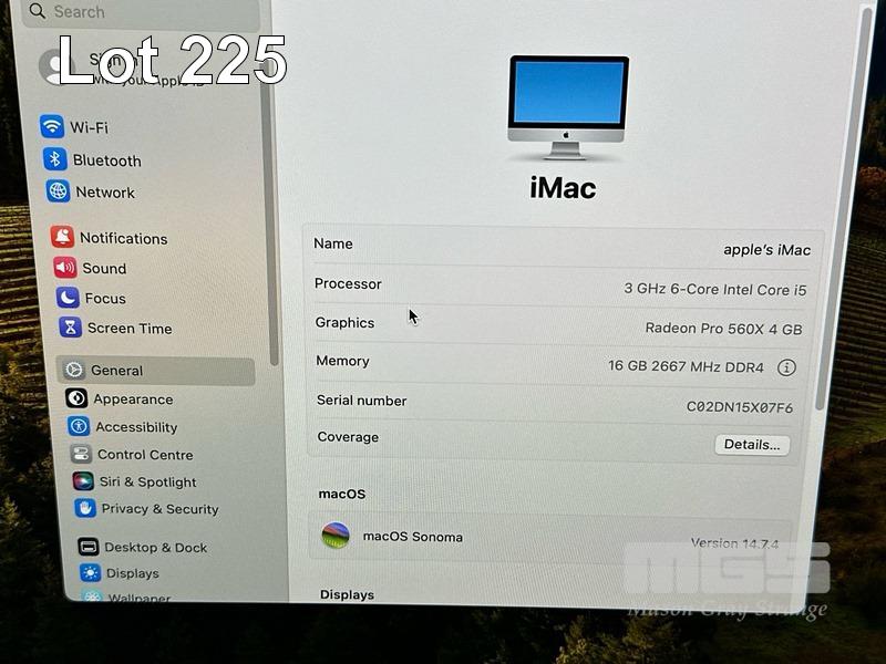 APPLE iMAC (A2116), CORE i5 8500 (8TH GEN) @ 3GHz, 16GB DDR4 RAM, 512GB SSD, BUILT-IN 21.5" RETINA DISPLAY (4096x2304), 4GB RADEON PRO 560X VIDEO, Wi-Fi, BLUETOOTH, MAC OS 14 INSTALLED, APPLE KEYBOARD & KENSINGTON MOUSE S/N:C02DN15X07F6