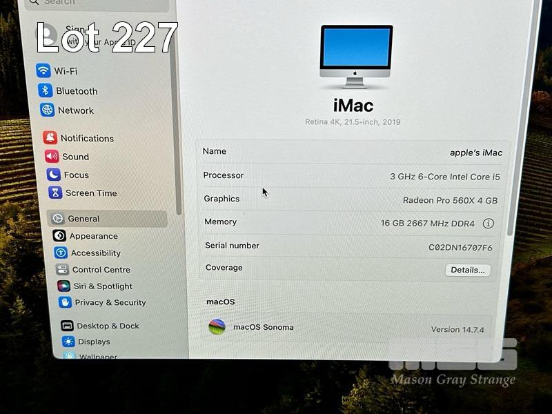 APPLE iMAC (A2116), CORE i5 8500 (8TH GEN) @ 3GHz, 16GB DDR4 RAM, 512GB SSD, BUILT-IN 21.5" RETINA DISPLAY (4096x2304), 4GB RADEON PRO 560X VIDEO, Wi-Fi, BLUETOOTH, MAC OS 14 INSTALLED, APPLE KEYBOARD & KENSINGTON MOUSE S/N:C02DN16707F6