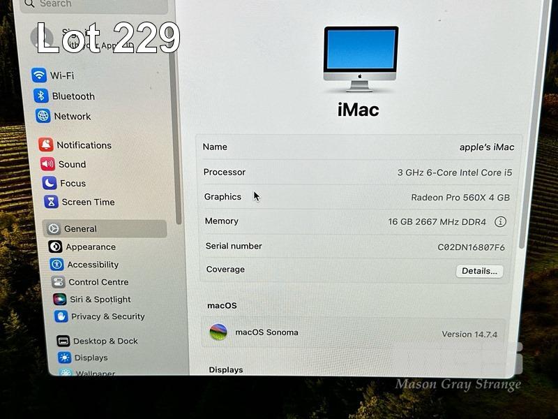 APPLE iMAC (A2116), CORE i5 8500 (8TH GEN) @ 3GHz, 16GB DDR4 RAM, 512GB SSD, BUILT-IN 21.5" RETINA DISPLAY (4096x2304), 4GB RADEON PRO 560X VIDEO, Wi-Fi, BLUETOOTH, MAC OS 14 INSTALLED, APPLE KEYBOARD & KENSINGTON MOUSE S/N:C02DN16807F6