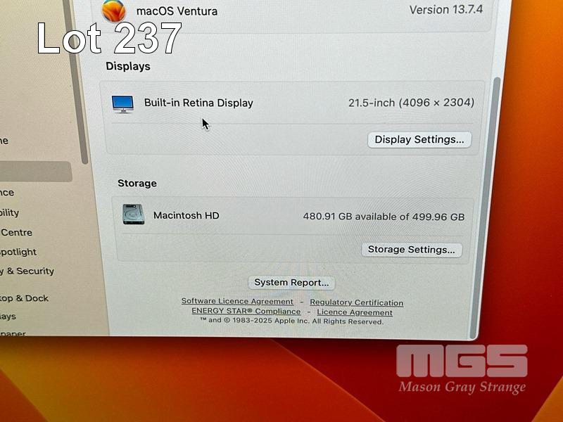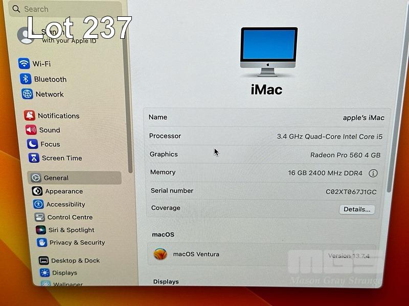 APPLE iMAC (A1418), CORE i5 7500 (7TH GEN) @ 3.4GHz, 16GB DDR4 RAM, 512GB SSD, BUILT-IN 21.5" RETINA DISPLAY (4096x2304), 4GB RADEON PRO 560 VIDEO, Wi-Fi, BLUETOOTH, MAC OS 13 INSTALLED (NO KEYBOARD, NO MOUSE) S/N:C02XT067J1GC