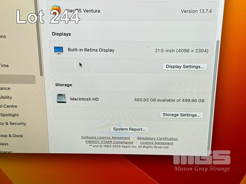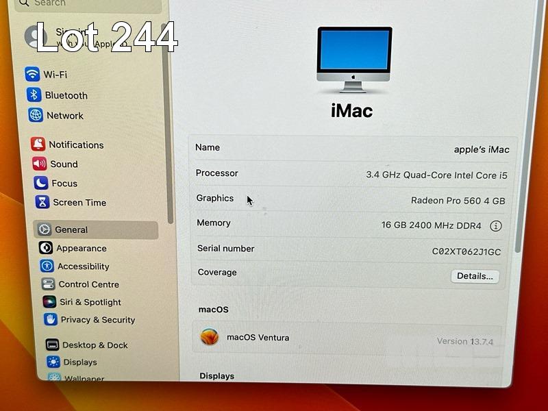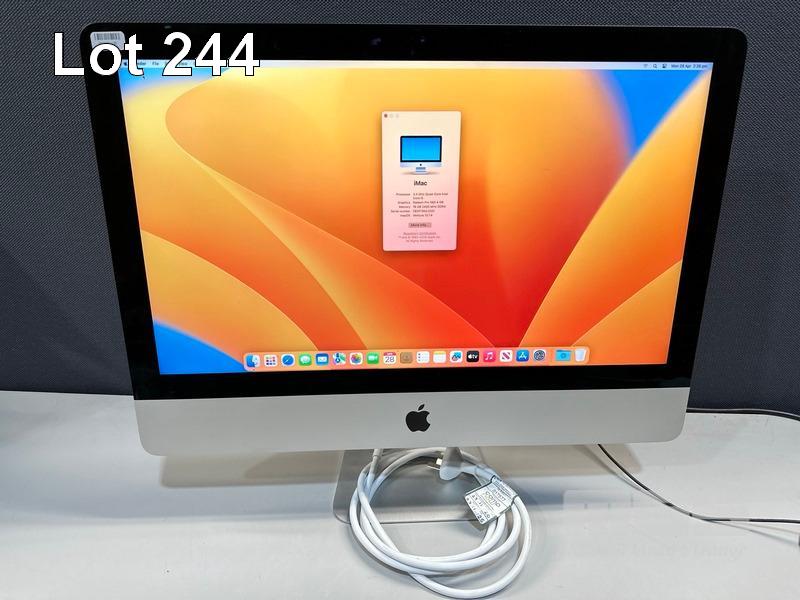 APPLE iMAC (A1418), CORE i5 7500 (7TH GEN) @ 3.4GHz, 16GB DDR4 RAM, 512GB SSD, BUILT-IN 21.5" RETINA DISPLAY (4096x2304), 4GB RADEON PRO 560 VIDEO, Wi-Fi, BLUETOOTH, MAC OS 13 INSTALLED (NO KEYBOARD, NO MOUSE) S/N:C02XT062J1GC