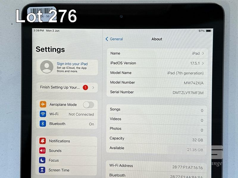 APPLE iPAD 7TH GEN, 32GB, Wi-Fi, SPACE GREY, MODEL MW742X/A, A2197 WITH CABLE & CHARGER (NOTE: MINOR SCRATCHES ON SCREEN) S/N:DMTZLV97MF3M