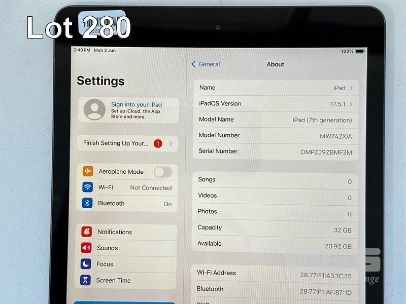 APPLE iPAD 7TH GEN, 32GB, Wi-Fi, SPACE GREY, MODEL MW742X/A, A2197 WITH CABLE & CHARGER (NOTE: MINOR SCRATCHES ON SCREEN) S/N:DMPZJ9ZBMF3M