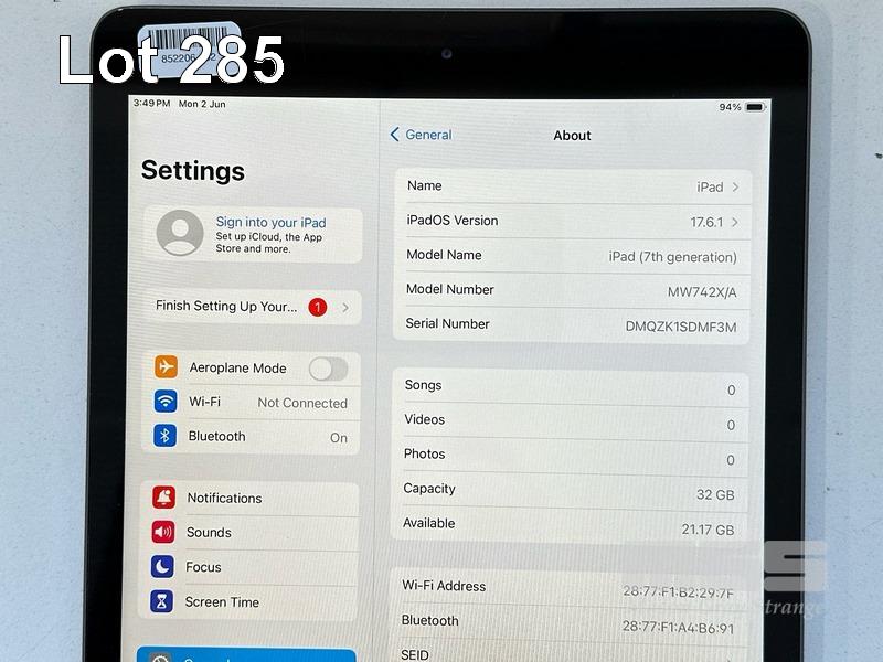 APPLE iPAD 7TH GEN, 32GB, Wi-Fi, SPACE GREY, MODEL MW742X/A, A2197 WITH CABLE & CHARGER (NOTE: SCRATCHES ON SCREEN) S/N:DMQK1SDMF3M