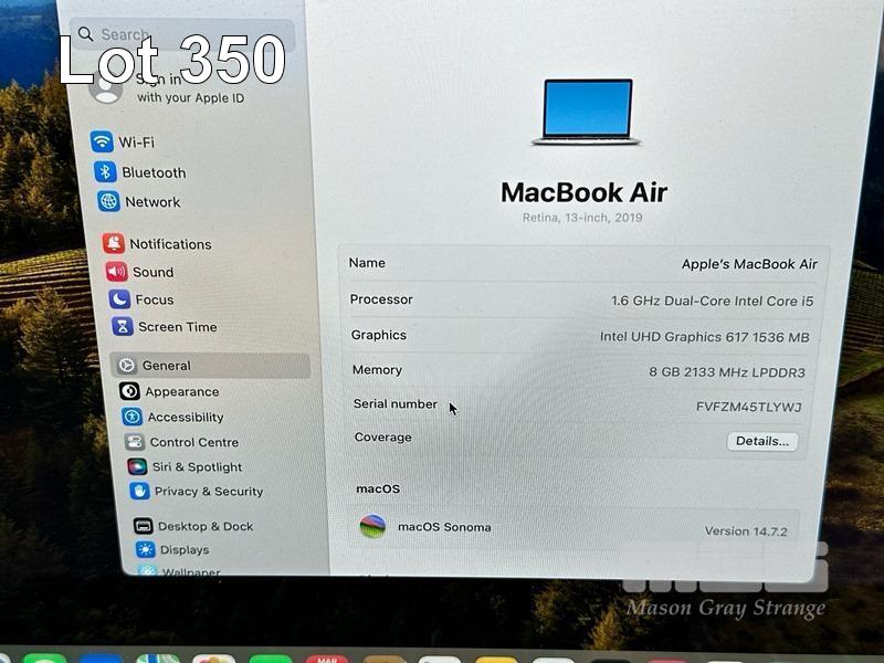 LAPTOP, APPLE MACBOOK AIR (A1932), CORE i5 8210Y (8TH GEN) @ 1.6GHz, 8GB DDR3 RAM, 128GB SSD, 13.3" RETINA DISPLAY (2560x1600), INTEL UHD GRAPHICS 617, Wi-Fi, BLUETOOTH, MAC OS 14 INSTALLED & USB-C POWER SUPPLY (NOTE: MINOR DAMAGE TO CASING, MARKS ON SCREEN) S/N:FVFZM45TLYWJ
