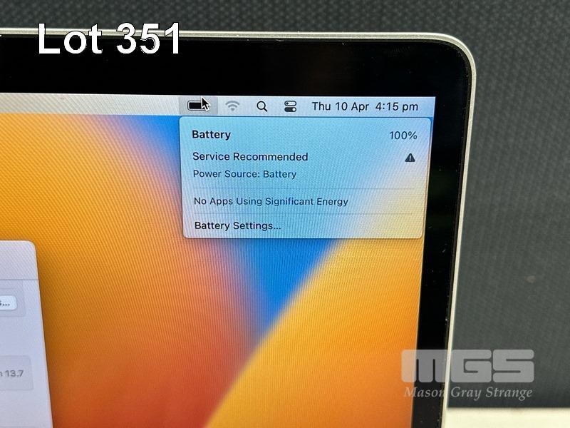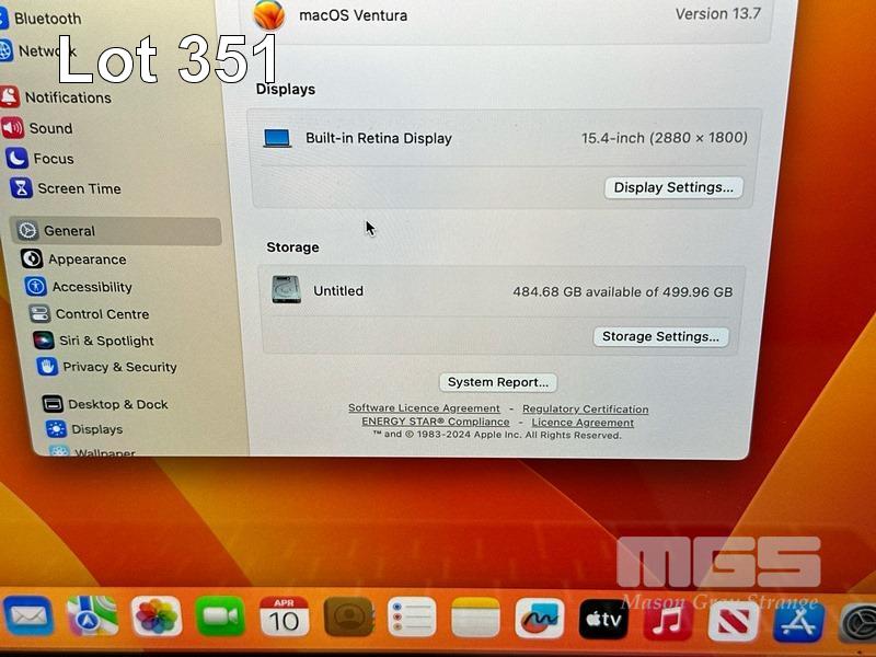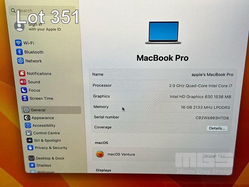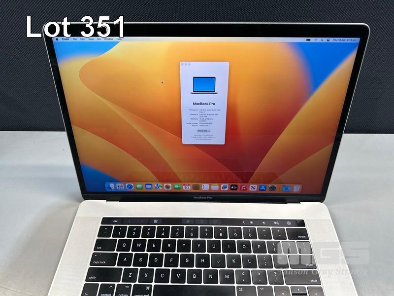 LAPTOP, APPLE MACBOOK PRO (A1707), CORE i7 7820HQ (7TH GEN) @ 2.9GHz, 16GB DDR3 RAM, 512GB SSD, 15.4" RETINA DISPLAY (2880x1800), INTEL HD GRAPHICS 630, Wi-Fi, BLUETOOTH, MAC OS 13 INSTALLED (NO USB-C POWER SUPPLY) (NOTE: BATTERY SERVICE RECOMMENDED MESSAGE, MARKS ON SCREEN) S/N:C02W6003HTD8