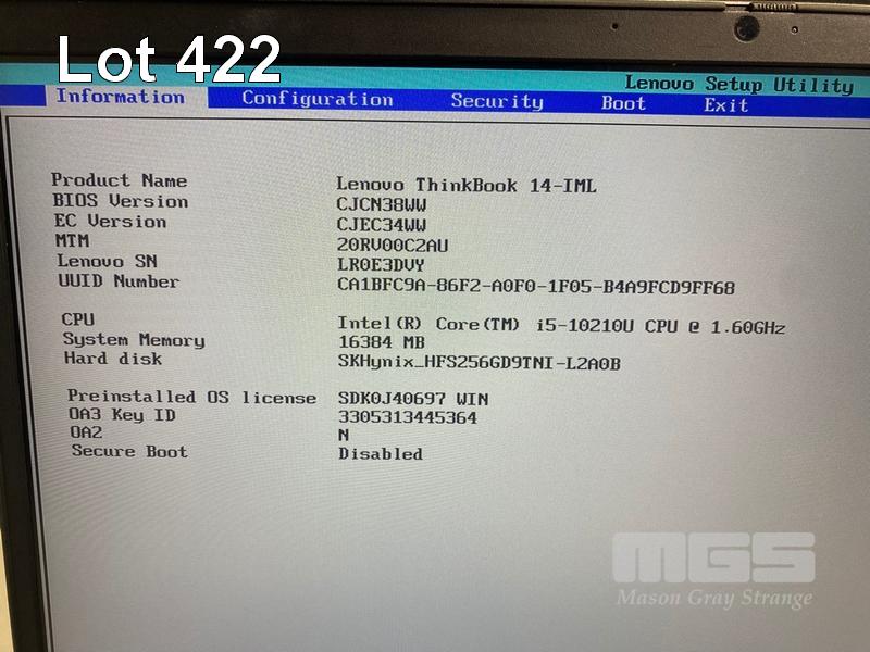 LAPTOP, LENOVO THINKBOOK 14-IML, TYPE 20RV, CORE i5 10210U (10TH GEN) @ 1.6GHz, 16GB DDR4 RAM, 256GB NVMe M.2 SSD, 14" WIDESCREEN (1920x1080), INTEL UHD GRAPHICS, Wi-Fi, BLUETOOTH, WINDOWS 11 PRO INSTALLED & POWER SUPPLY (NOTE: MISSING RUBBER STRIP UNDERNEATH, MARKS ON SCREEN) S/N:LR0E3DVY