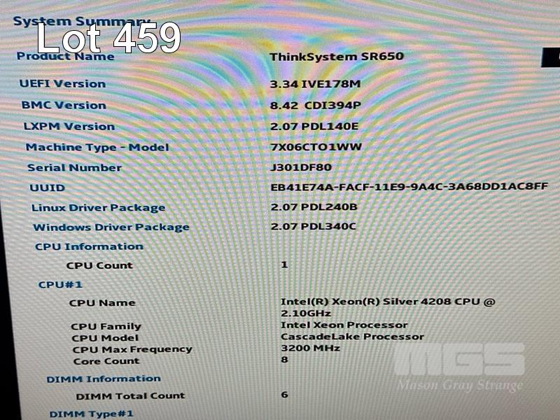 RACKMOUNT SERVER, LENOVO THINKSYSTEM SR650, 2U, XEON SILVER 4208 @ 2.1GHz, 96GB RAM, 5 x 900GB SAS (12Gbps) HDD, 2 x 750W PSU (NO CABLES) S/N:J301DF80