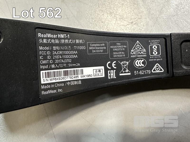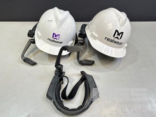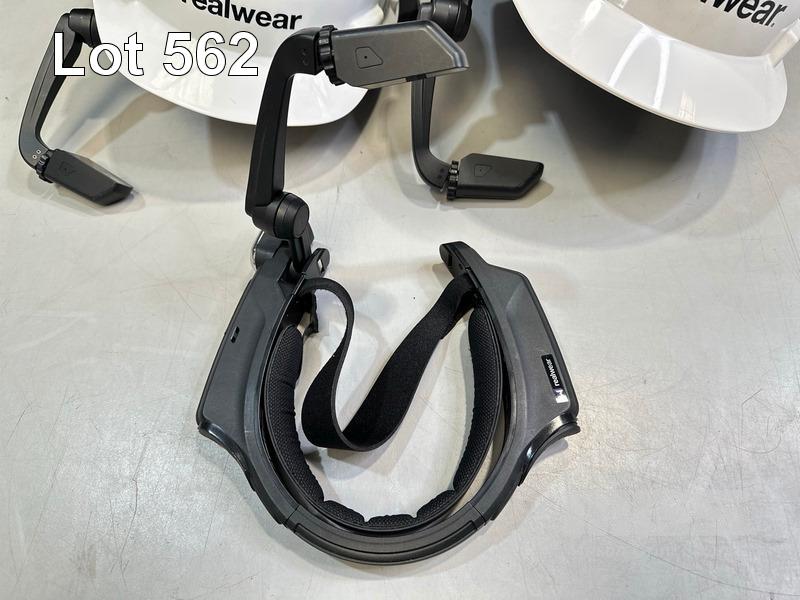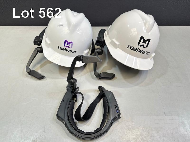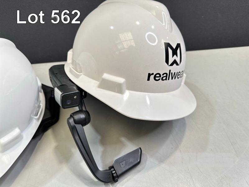 3 x REALWEAR HMT-1 WEARABLE TABLET COMPUTER HEADSETS, MODEL T1100G WITH 2 x SAFETY HELMETS (NO CABLES, NO CHARGERS)