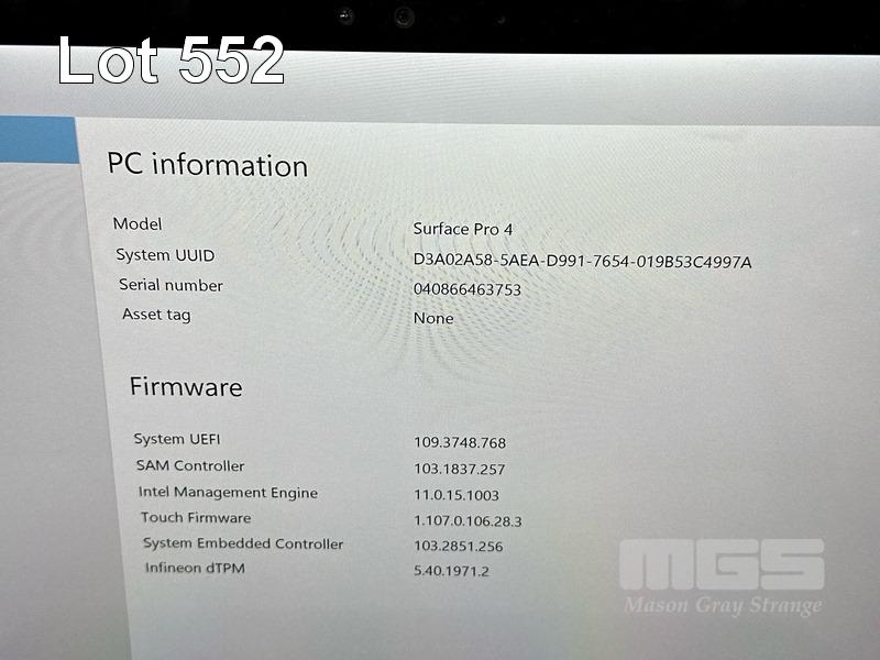 TABLET PC, MICROSOFT SURFACE PRO 4, MODEL 1724, CORE i7 6650U (6TH GEN) @ 2.2GHz, 16GB RAM, 256GB SSD, 12.3" TOUCHSCREEN (2736x1824), INTEL HD GRAPHICS 520, Wi-Fi, BLUETOOTH, WINDOWS 10 PRO INSTALLED, KEYBOARD TYPE COVER & POWER SUPPLY S/N:040866463753