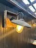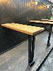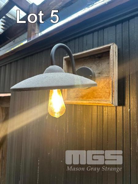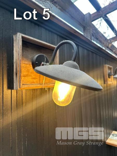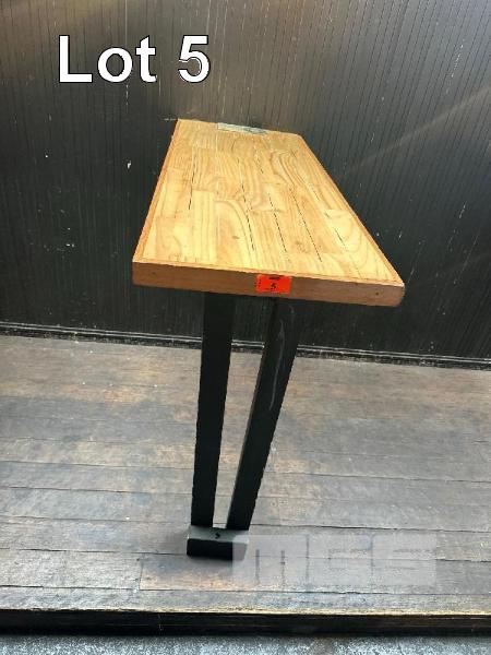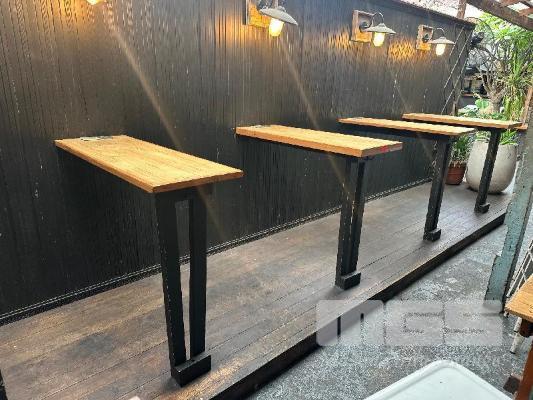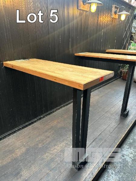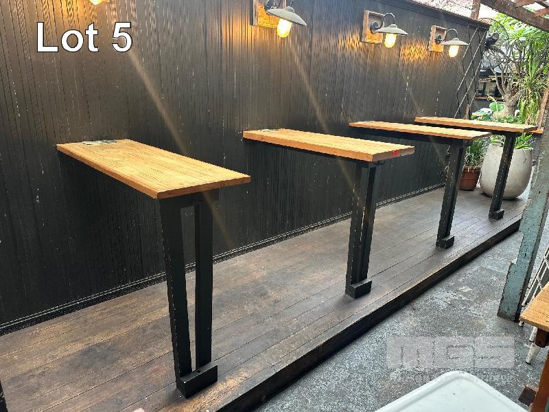 4 x TIMBER BAR TOPS, SINGLE LEG WALL MOUNT 1200 x 430 x 1060mm(H) & 8 x VINTAGE WALL MOUNT LIGHTS (BUYER TO REMOVE)