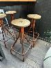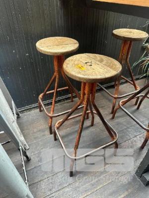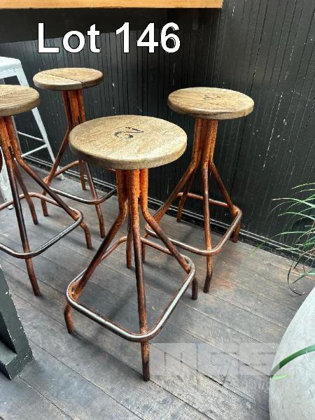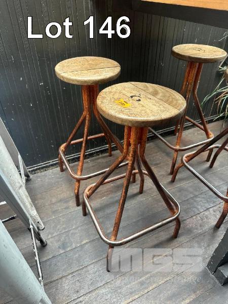 4 x ANTIQUE STEEL FRAME TIMBER TOP BAR STOOLS, 750mm (H)