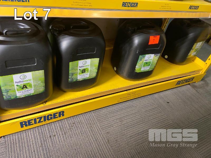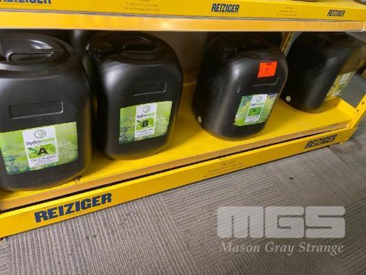 2 x HYDROWORLD COCO NUTRIENT, A, 20 LITRE, 2 x HYDROWORL COCO NUTRIENT B, 20 LITRE, 2 x HYDROWORLD FLOWER ENHANCER, 20 LITRE & HYDROWORLD SYSTEM CLEANER, 20 LITRE, CONTENTS SHELF