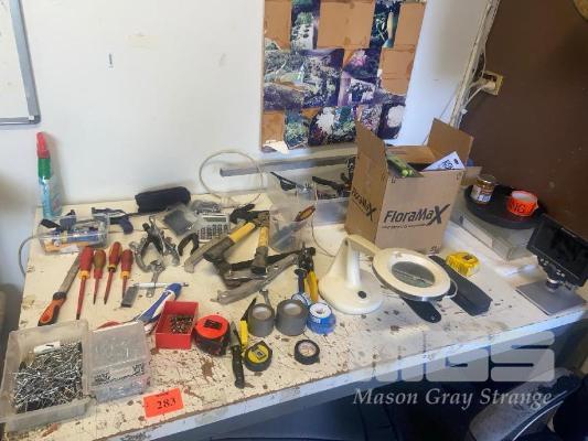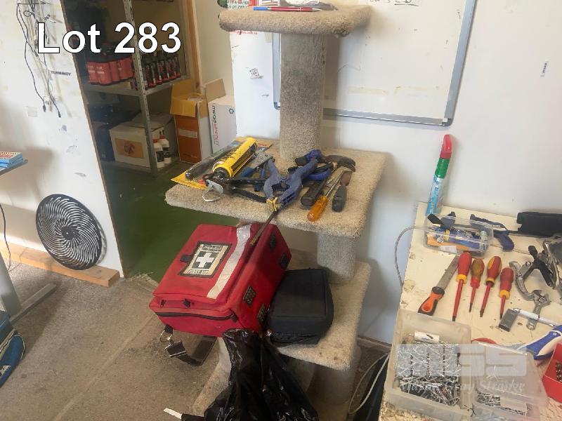 ASSORTED HAND TOOLS, TAPES RIVETS, DESK ,BENCH & CHAIR AND CAT STAND