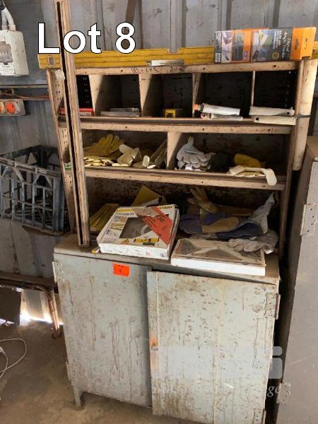 STEEL STORAGE CUPBOARD, 2 DOOR & SHELF UNIT & CONTENTS INCLUDING SAFETY GLOVES, RA SQUARES, LEVEL & STEEL RULER