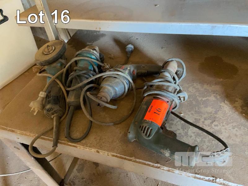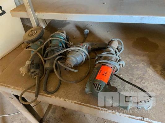 4 x POWER TOOLS INCLUDING, METABO TEK GUN, BOSCH DRILL, GS1ORE & 2 x SMALL ANGLE GRINDERS