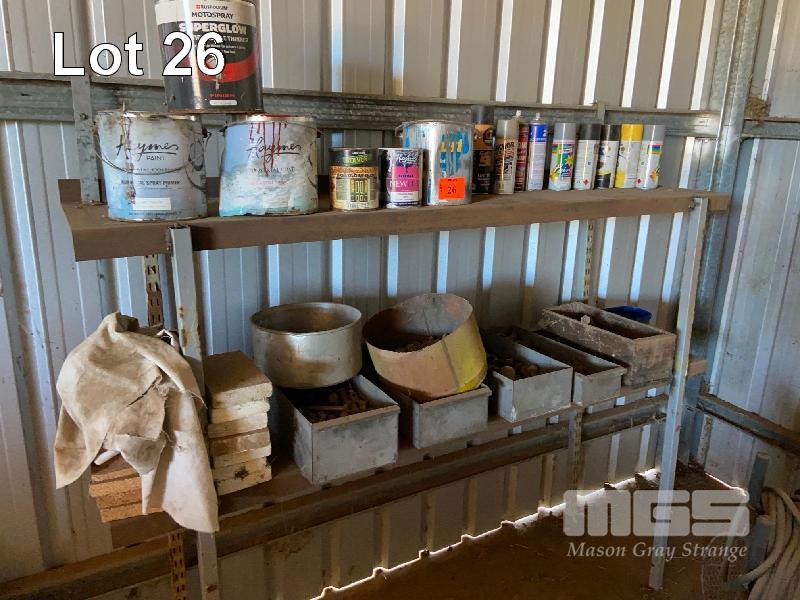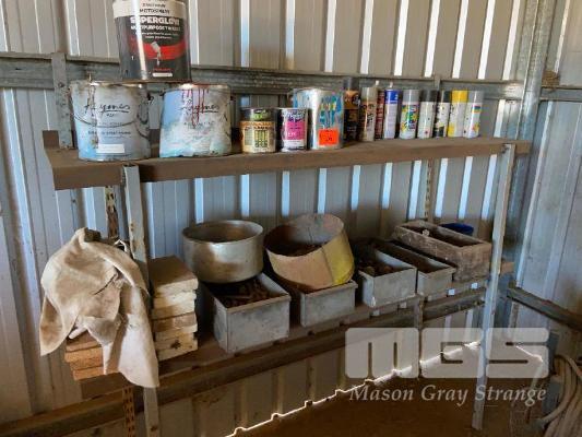 STORAGE RACK & CONTENTS PAINTS, NUTS,BOLTS, THINNERS, ETC