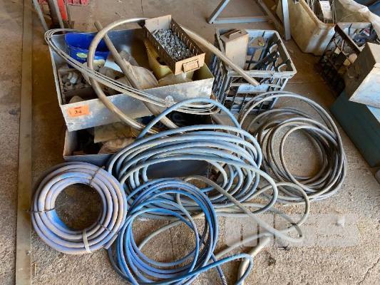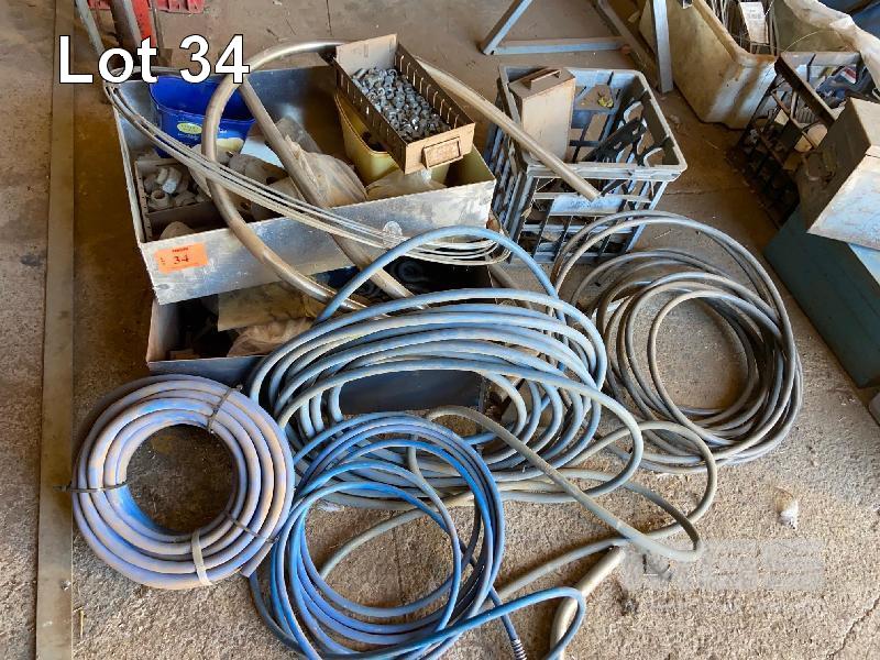 2 x METAL TRAY & CONTENTS, STAINLESS STEEL & STEEL FITTINGS & HARDWARE, AIR HOSE & WHEELS