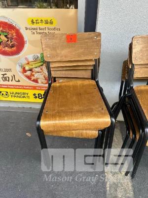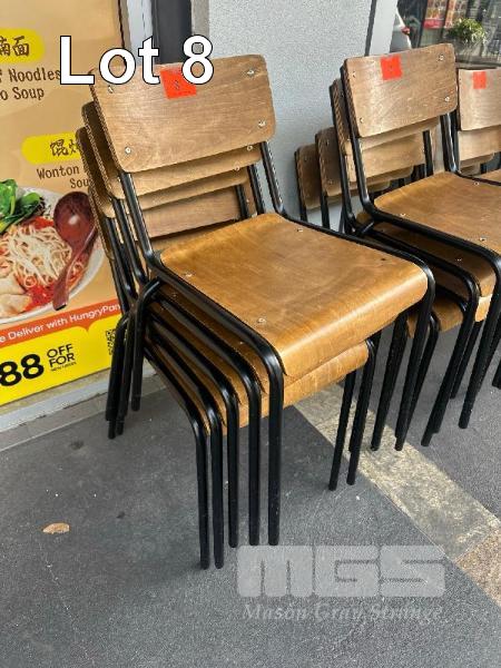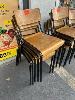 10 x TIMBER DINING CHAIRS, BLACK STEEL FRAME, STACKABLE