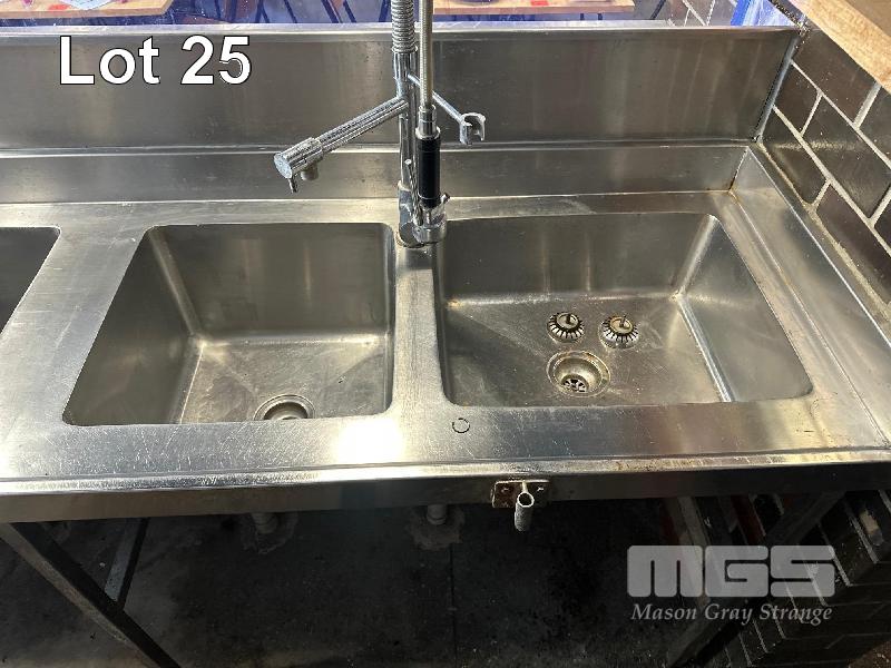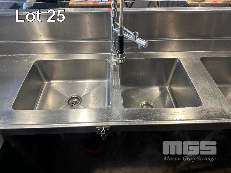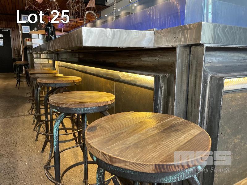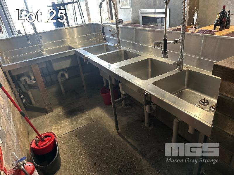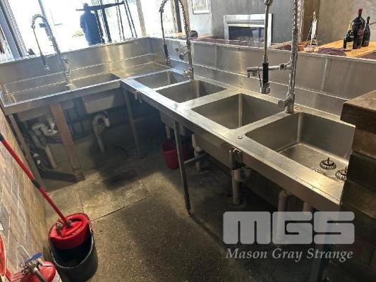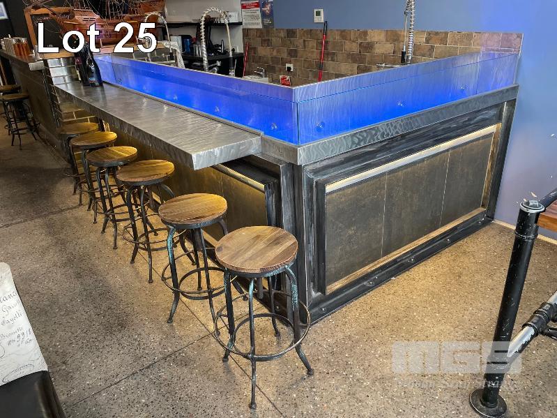 OYSTER SHUCKING STATION & BAR FRONT COMPRISING L-SHAPE STAINLESS STEEL BENCH, 3000 x 1730 x 630 x 980mm (W) WITH 6 x DEEP BOWL SINKS, 3 x SPRING RINSE TAPS, GLASS FRONT ICE TROUGH, 3300 x 2000 x 260mm, HEAVY DUTY STEEL FRAME BOLTED TO FLOOR NOTE: BUYER TO DISMANTLE & REMOVE