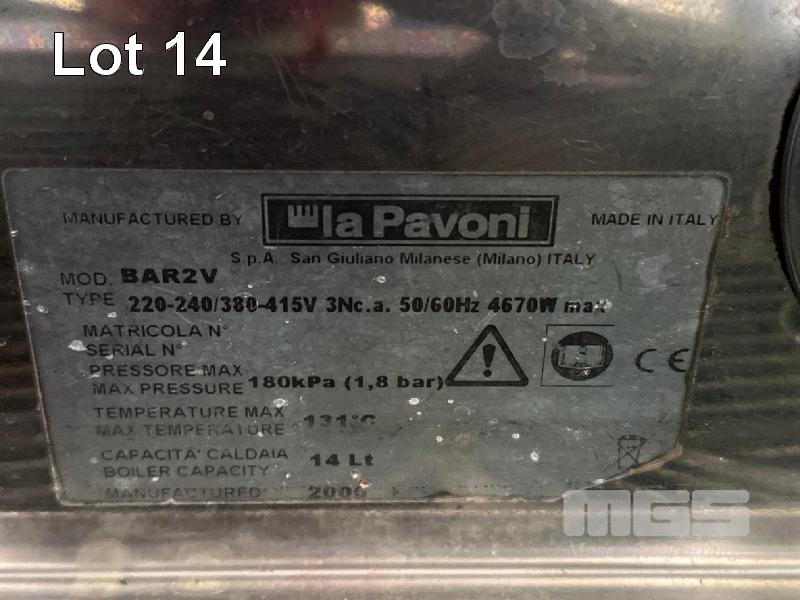 ESPRESSO MACHINE, LA PAVONI MOD: BAR2V DOM: 2000 3 GROUP, 2 HANDLES 240V, 15 AMP