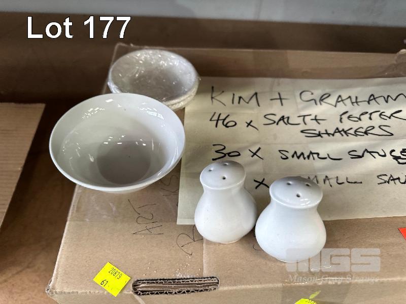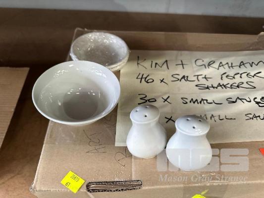 46 x SALT & PEPPER SHAKERS, 30 x SMALL SAUCE DISHES & 22 x SMALL SAUCE BOWLS 1 x BOX