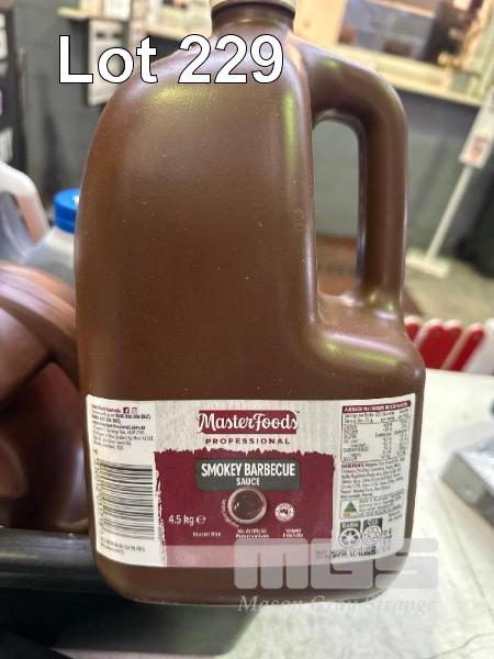 6 x BOTTLES MAPLE FLAVOURED SYRUP, 3 LITRE, 1 x BOTTLE MANGO TOPPING, 3 LITRE, 1 x BOTTLE SMOKEY BBQ SAUCE, 4.5kg, 1 x BOTTLE BBQ SAUCE, 4 LITRE, 1 x BOTTLE WORCESTERSHIRE SAUCE, 4 LITRE & 1 x FRENCH CLASSIC YELLOW MUSTARD, 2.98kg