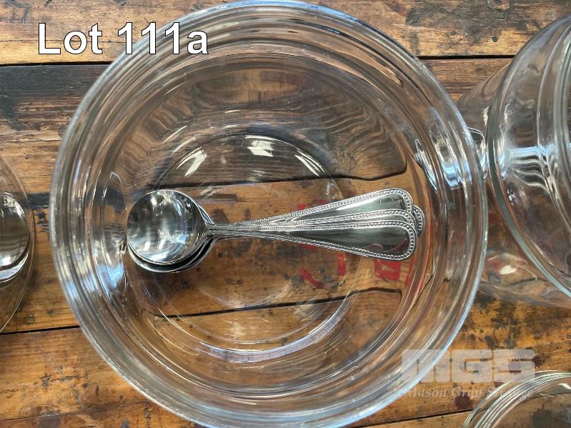 3 x MAXWELL WILLIAMS 24cm BOWLS, 1 x MAXWELL WILLIAMS 28cm BOWL, 8 x GLASS STORAGE CONTAINERS, 38 x DESSERT SPOONS