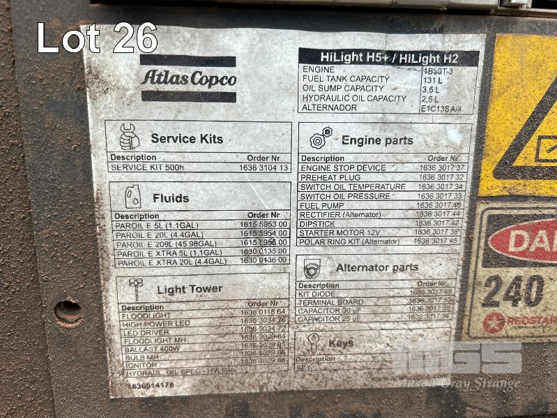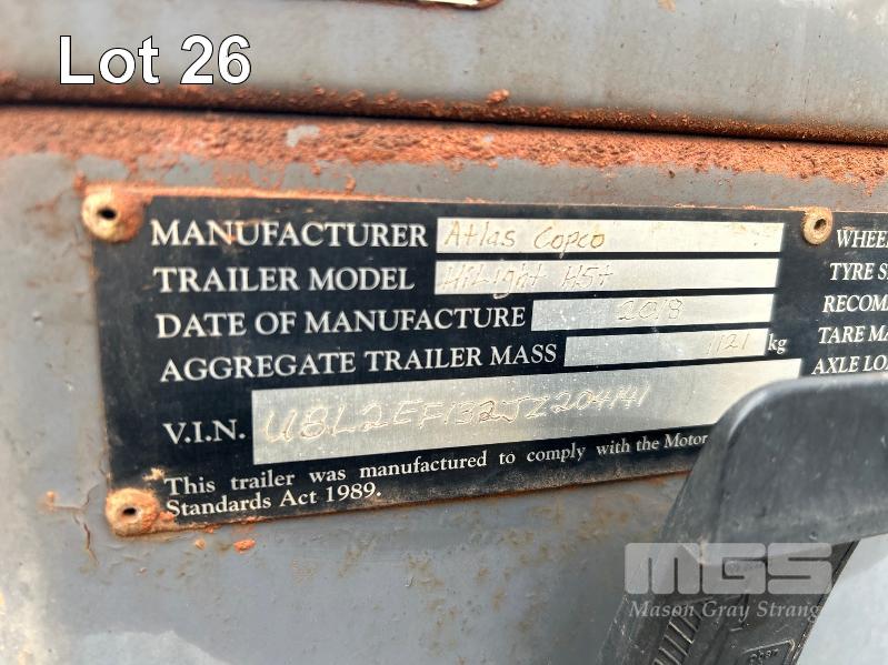 2018 MOBILE LIGHTING TOWER, ATLAS COPCO MOD: HI LIGHT H5T SINGLE AXE REG: NO PLATES VIN: UBL2EF132JZ204141 ATM: 1121kg POWERED BY 1B50T DIESEL ENGINE 2.7 KVA ALTERNATOR, HOURS: NOT SHOWING HYDRAULIC TELESCOPIC MAST 4 x LED LIGHTS, BALL HITCH, JOCKEY WHEEL