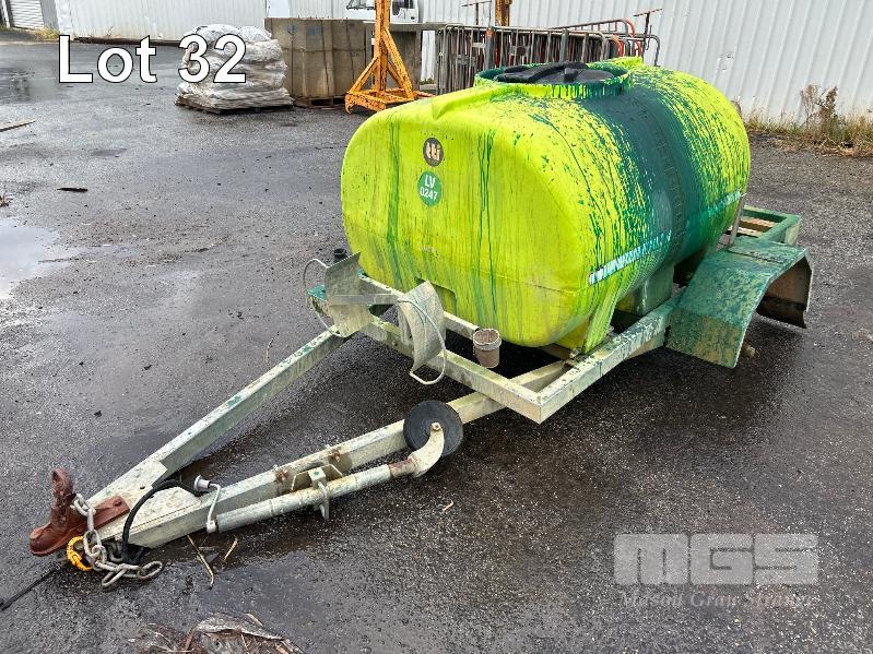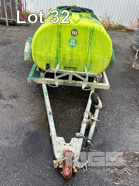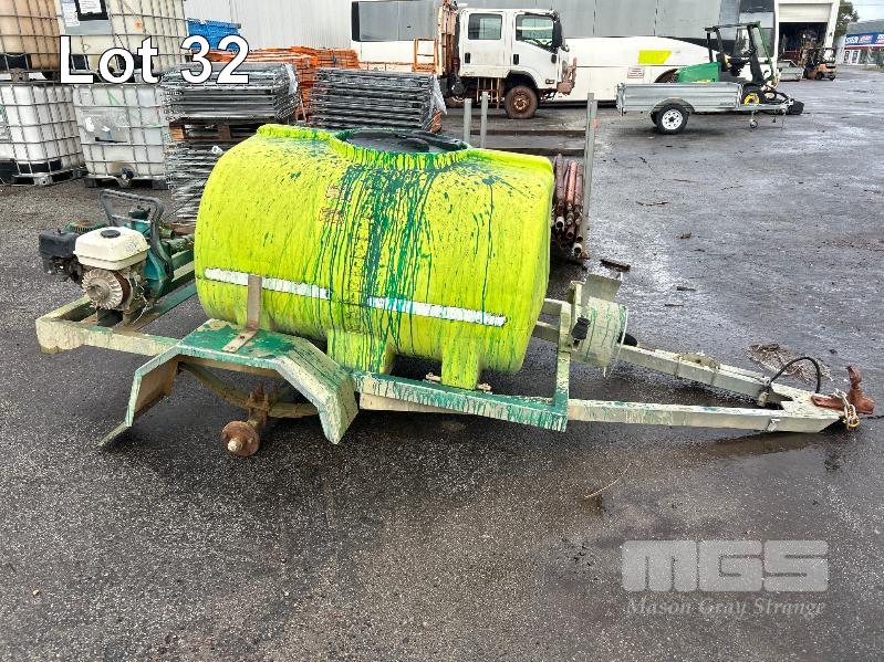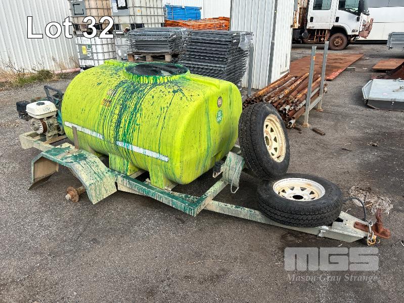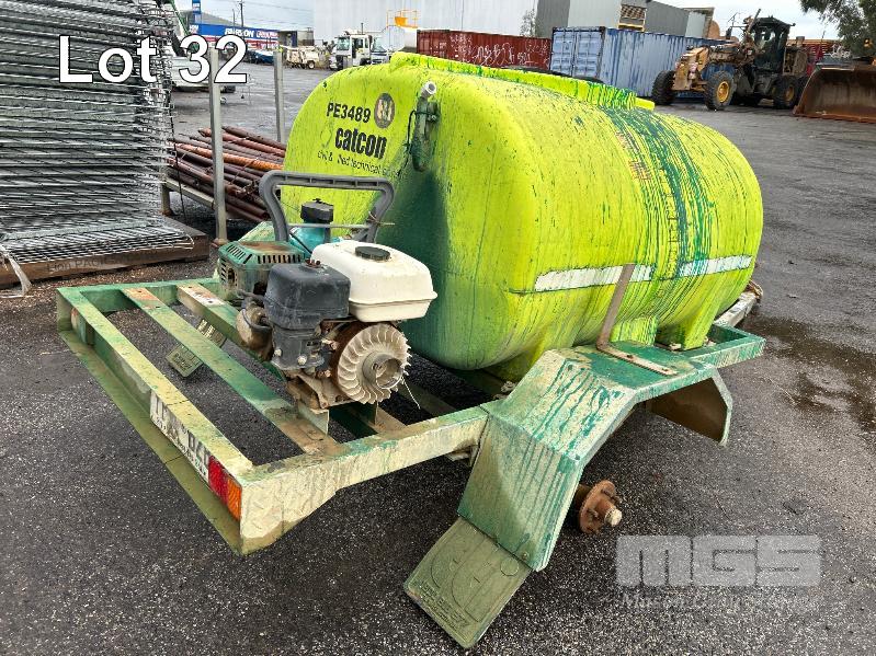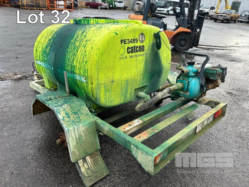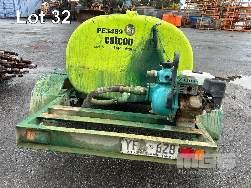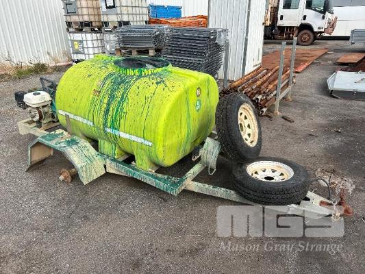 WATER TANK TRAILER REG: YFA 628 SINGLE AXLE FITTED WITH POLY TANK, 1,000 LITRE CAPACITY PETROL WATER PUMP, ONGA BLAZEMASTER BALL HITCH, JOCKEY WHEEL WITH WHEELS BUT NO WHEEL NUTS