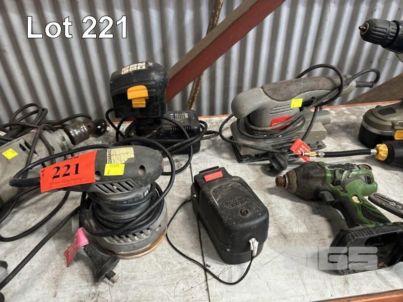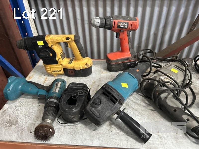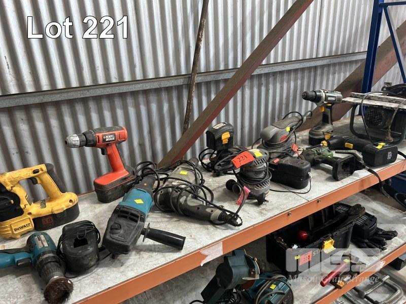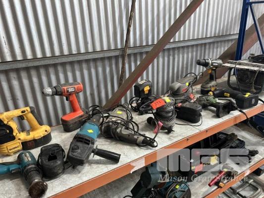 CORDLESS & 240V POWER TOOLS INCLUDING TILE CUTTER, DRILLS, SANDERS, ETC 1 x SHELF