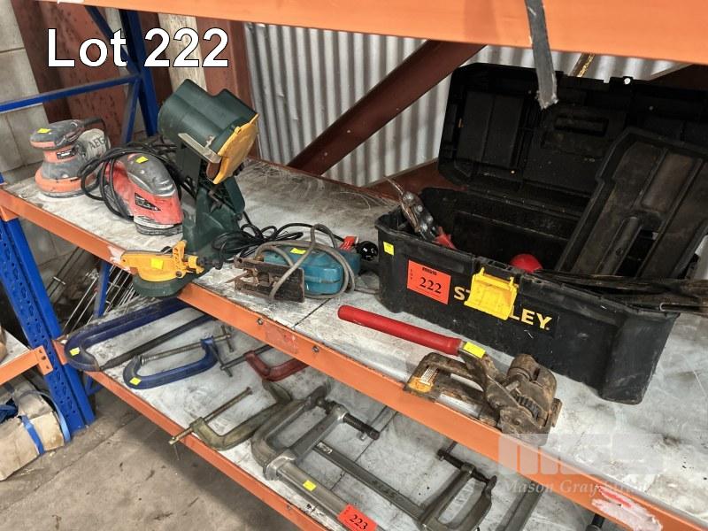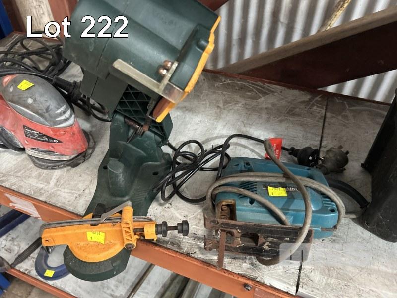 STEEL STRAPPING TENSIONER TOOL, CRIMPER & CUTTERS, CHAINSAW SHARPENING TOOL, 240V, 2 x ORBITAL SANDERS & JIGSAW, 240V