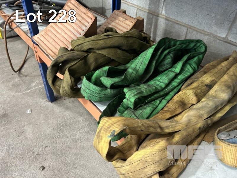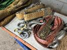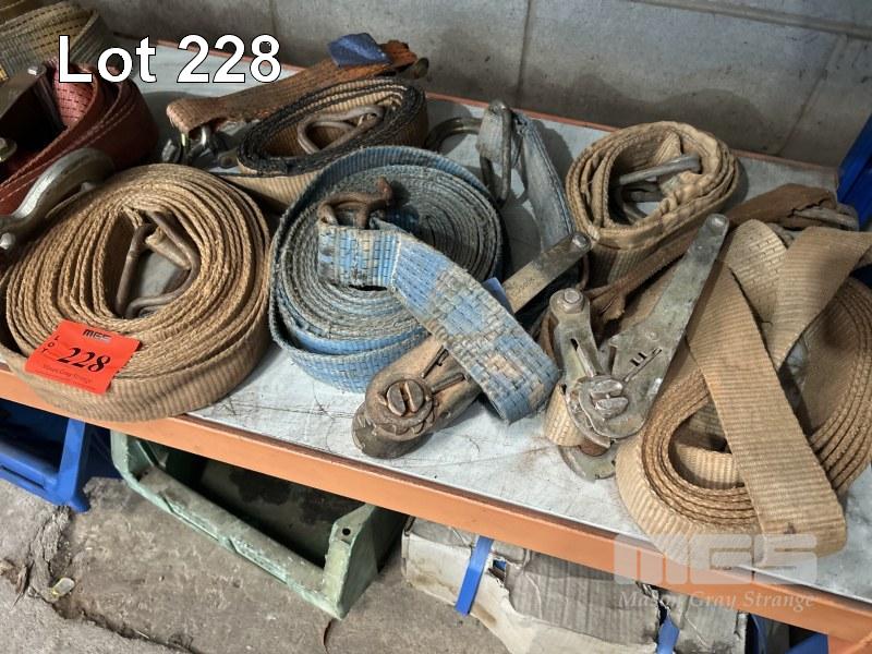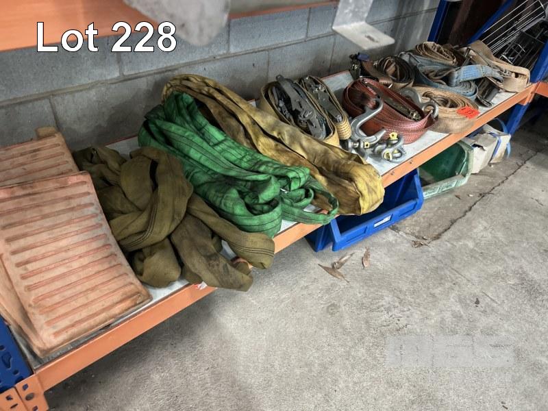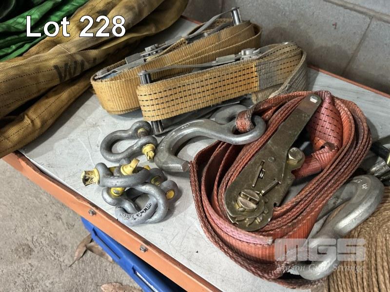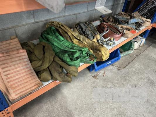 8 x RATCHET STRAPS, 3 x LIFTING SLINGS, D-SHACKLES, VEHICLE CHOCKS, ETC