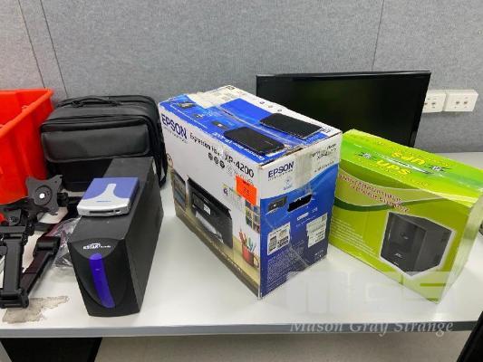 EPSON EXPRESSION PRINTER, ACL POWER SUPPLY, K STAR UPS, 2 x SAMSUNG PHONES, MONITOR & ARM, POWER SUPPLIES, ETC