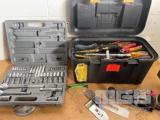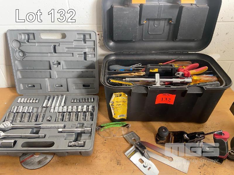 TOOL KIT TOOLS, DRIVERS, CUTTERS, PLANE, 1/2" SOCKET SET ON BENCH