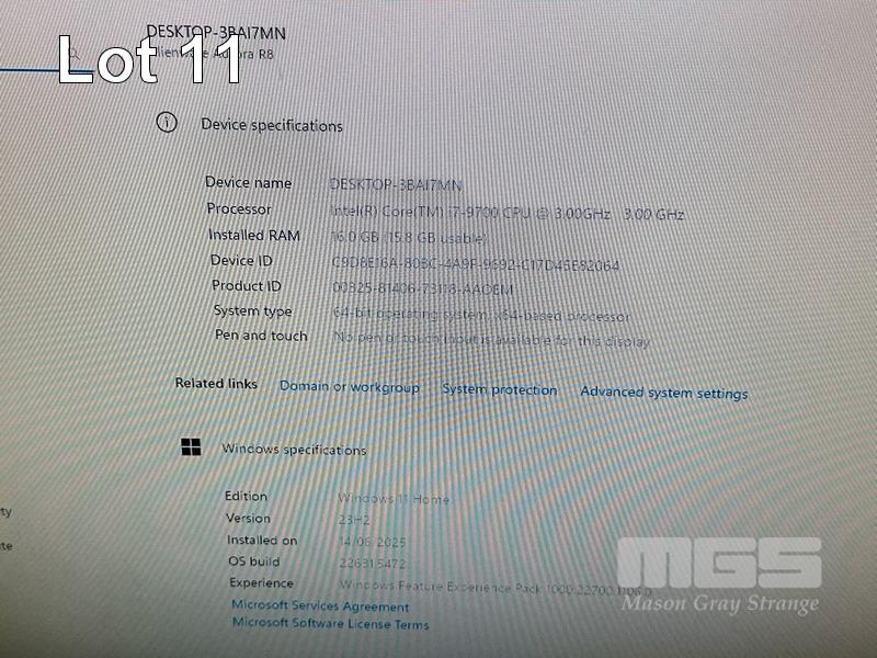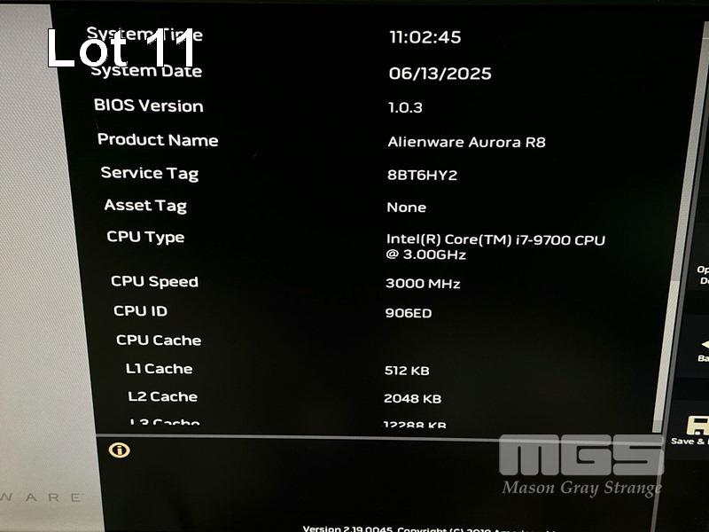 GAMING PC, ALIENWARE AURORA R8, CORE i7 9700 (9TH GEN) @ 3GHz, 16GB DDR4 RAM, 256GB NVMe M.2 SSD, 1TB SATA HDD, DVD-RW, 8GB NVIDIA GEFORCE RTX 2070 VIDEO, Wi-Fi, BLUETOOTH, WINDOWS 11 HOME INSTALLED, KEYBOARD & MOUSE S/N:8BT6HY2