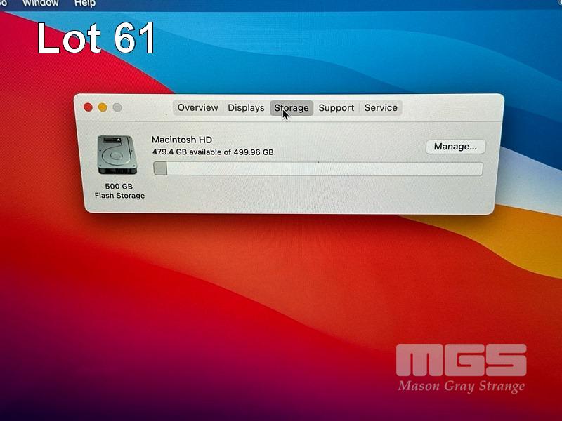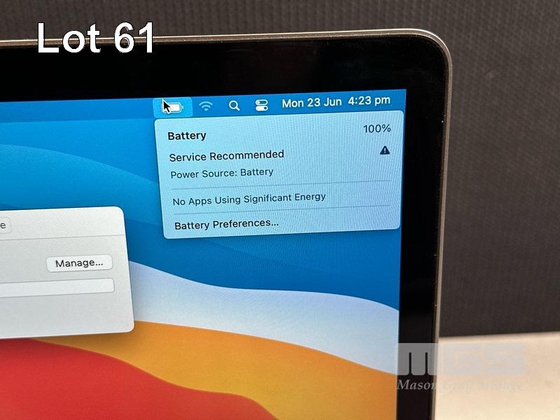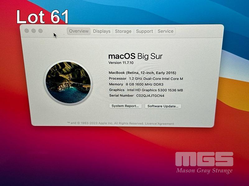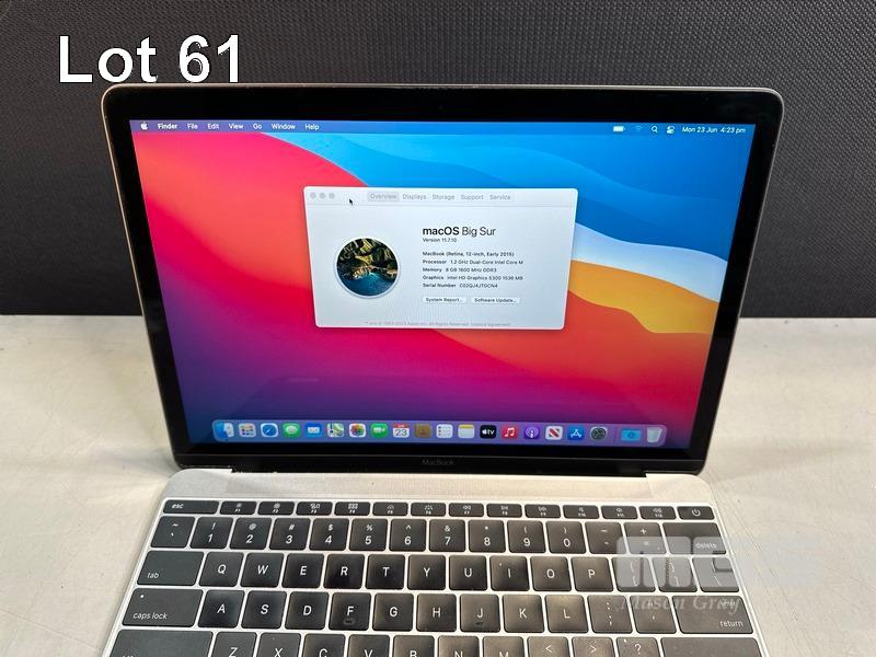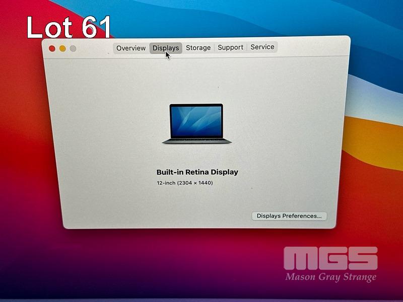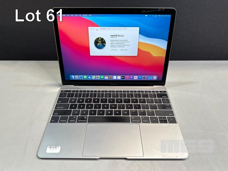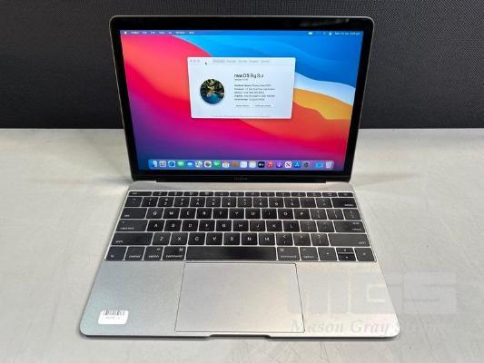 LAPTOP, APPLE MACBOOK (A1534), CORE M-5Y51 @ 1.2GHz, 8GB DDR3 RAM, 512GB SSD, 12" RETINA DISPLAY (2304x1440), INTEL HD GRAPHICS 5300, Wi-Fi, BLUETOOTH, MAC OS 11.7 INSTALLED (NO USB-C POWER SUPPLY) (NOTE: "BATTERY SERVICE RECOMMENDED" MESSAGE, MINOR MARKS ON SCREEN) S/N:C02QJ4JTGCN4