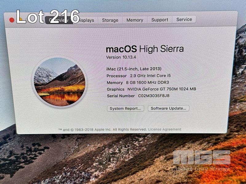 APPLE iMAC (A1418), CORE i5 4570S (4TH GEN) @ 2.9GHz, 8GB DDR3 RAM, 1.12TB FUSION DRIVE, BUILT-IN 21.5" DISPLAY (1920x1080), 1GB NVIDIA GEFORCE GT 750M VIDEO, Wi-Fi, BLUETOOTH, MAC OS 10.13 INSTALLED (NO KEYBOARD, NO MOUSE) S/N:C02M3035F8J8