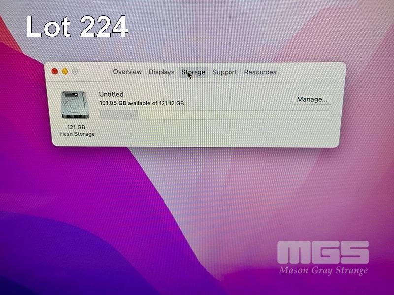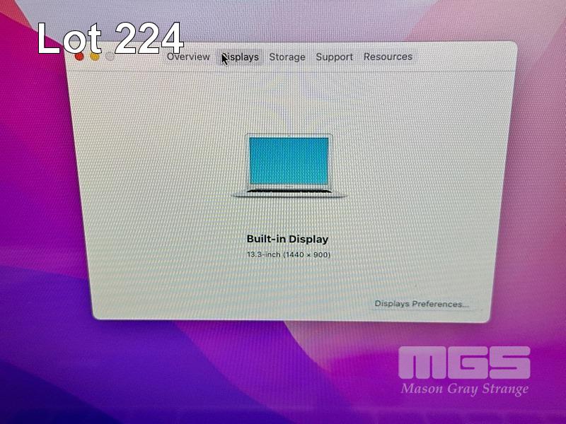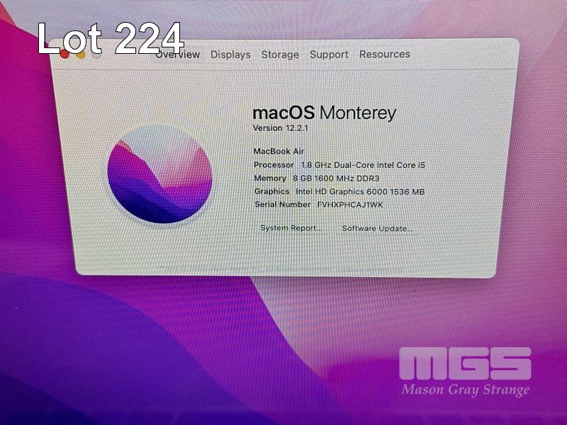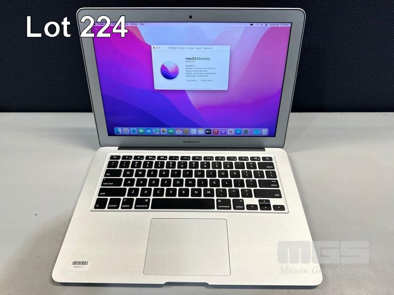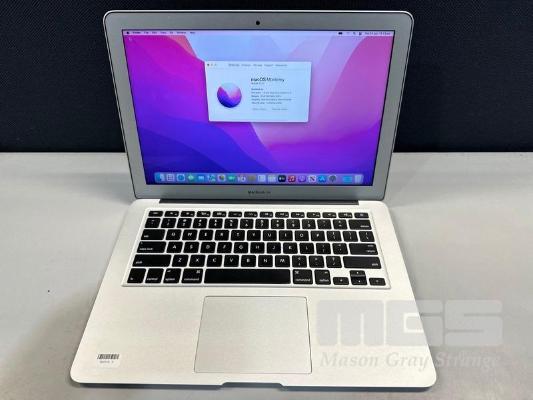 LAPTOP, APPLE MACBOOK AIR (A1466), CORE i5 5350U (5TH GEN) @ 1.8GHz, 8GB DDR3 RAM, 128GB SSD, 13.3" DISPLAY (1440x900), INTEL HD GRAPHICS 6000, Wi-Fi, BLUETOOTH, MAC OS 12 INSTALLED & POWER SUPPLY (NOTE: SMALL DENT ON CASING) S/N:FVHXPHCAJ1WK