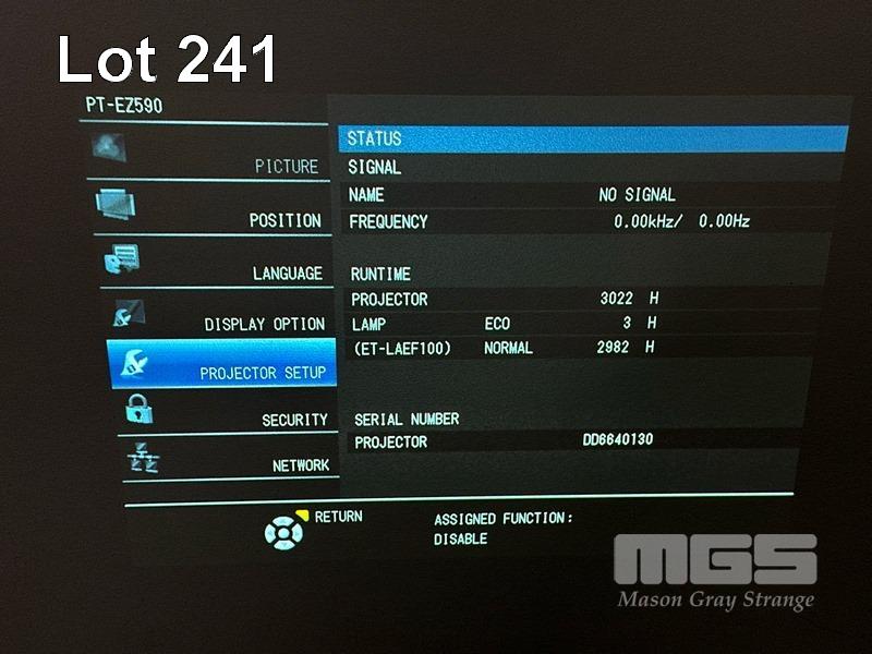 PROJECTOR, PANASONIC PT-EZ590 WUXGA 3LCD, 5,400 LUMENS, 3,022 HOURS SHOWING WITH REMOTE S/N:DD6640130