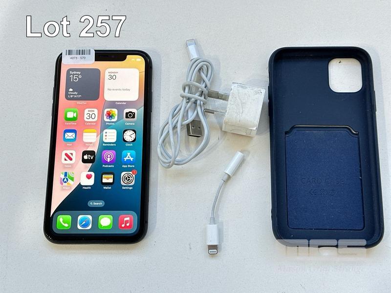 APPLE iPHONE 11, 64GB, BLACK, MODEL MHDA3X/A, BATTERY HEALTH 93% WITH CABLE, CHARGER & COVER (NOTE: MINOR SCRATCHES ON SCREEN) S/N:DX3HPYS1N735